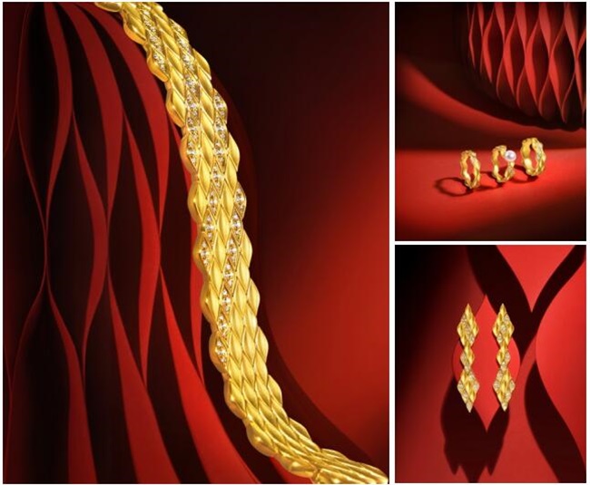 YuYu足金系列则与新春氛围相得益彰,温润黄金融合精湛喷砂工艺,精致榄尖图形簇拥延伸,呈现如缎质感,生动凝练游鱼的悠然姿态,将“有鱼有乐,丰衣足食”的美好祈愿化为细腻安然的陪伴,使传统年俗更具温度,更以优雅现代的造型点亮过年穿搭。